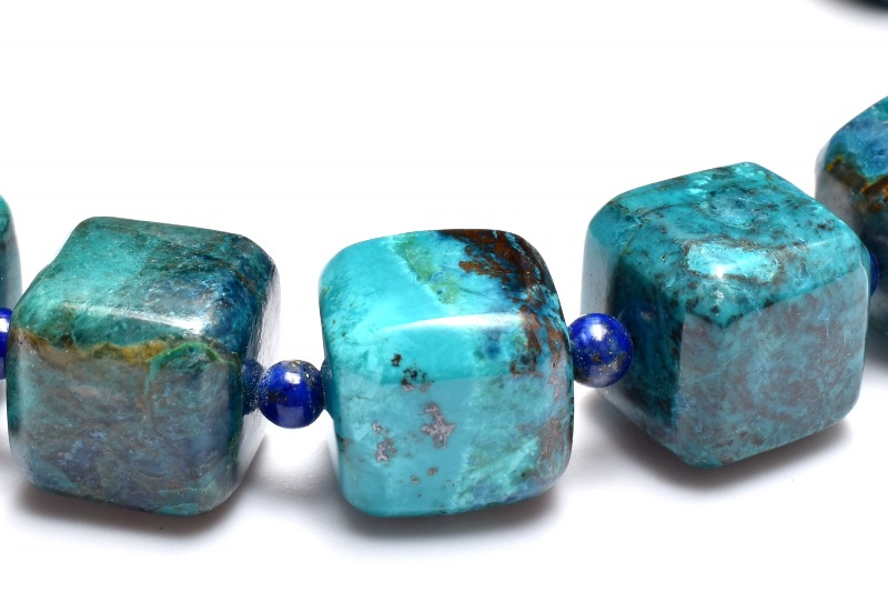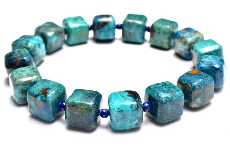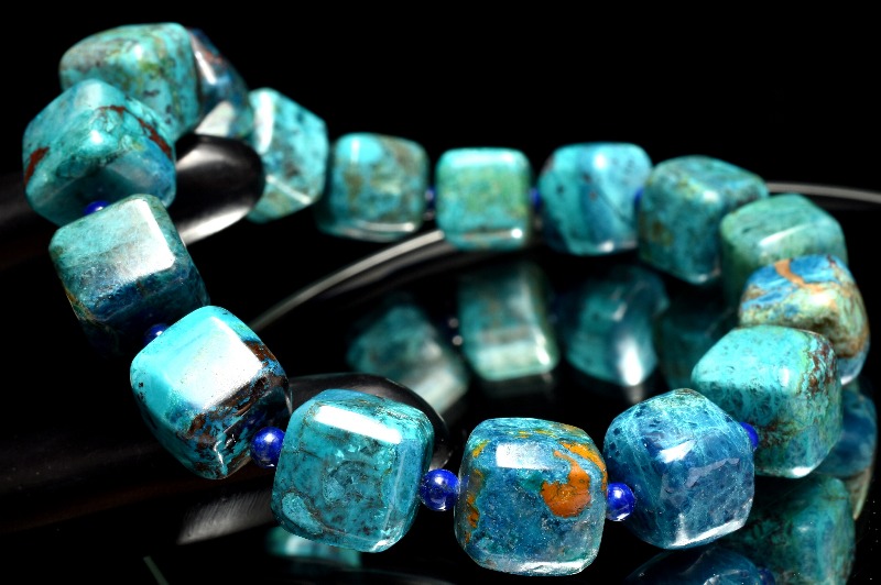 【1点物】シリカ共生◇高発色 クリソコラ 10x10(丸玉5.5)mm キューブ (丸玉ラピスラズリ) ブレスレット _MC2557