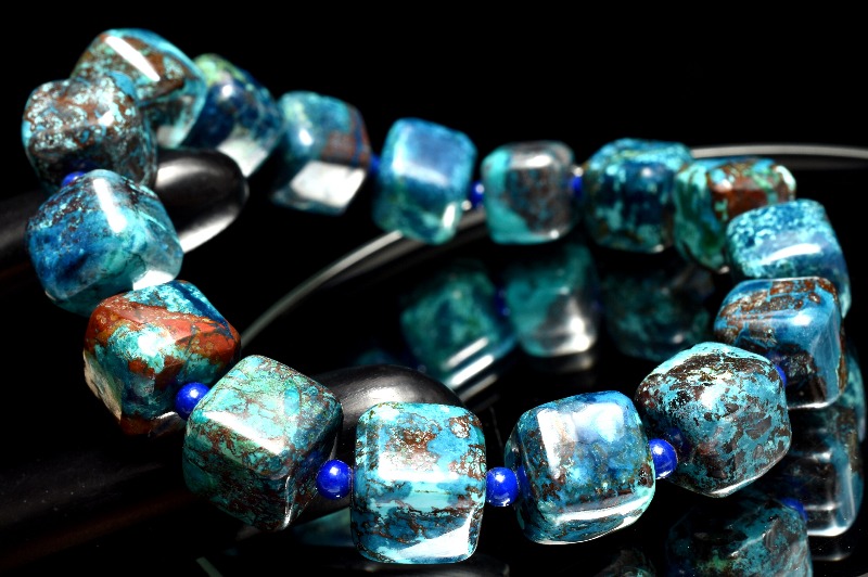 【1点物】シリカ共生◇高発色 クリソコラ 9-10x9.5-10.5(丸玉3)mm キューブ (丸玉ラピスラズリ) ブレスレット _MC2562