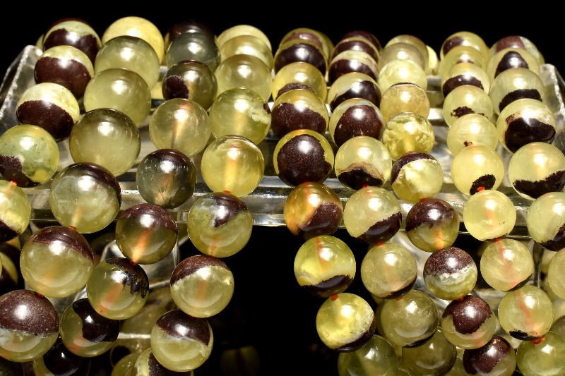 和名でぶどう石とも呼ばれるこの石は、本当にぶどうのように見える原石が存在する事に由来します。しかしそのような形状で産出するものは少なく、加工品の多くは塊状の原石から研磨されます。