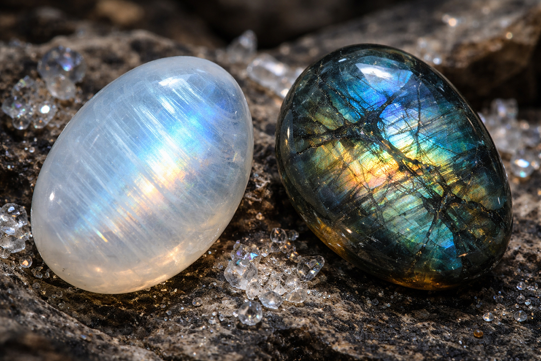 ムーンストーンとラブラドライトは、同じ長石グループに属しながらも鉱物の種類・化学組成・結晶系が異なる、個性豊かな2つのパワーストーンです。