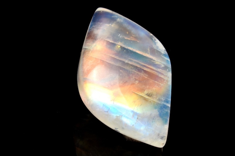 レインボームーンストーン(ホワイトラブラドライト)とは レインボームーンストーンとは、透き通る白色の地色に虹色の光彩を放つ、斜長石系鉱物の一種です。名称に「ムーンストーン」と入っていますが、これは流通...