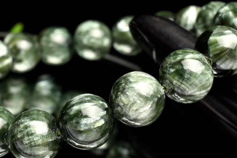 深緑色の地石の中に、白色〜銀色に輝く色彩の模様が「天使の羽」のように見えることがセラフィナイトの特徴です。