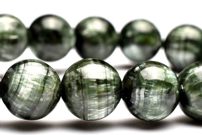 深緑色の地石の中に、白色〜銀色に輝く色彩の模様が「天使の羽」のように見えることがセラフィナイトの特徴です。