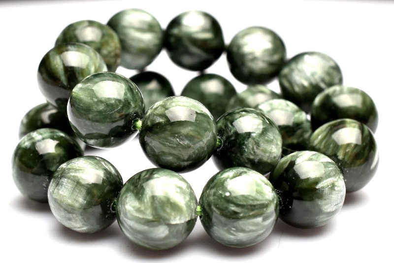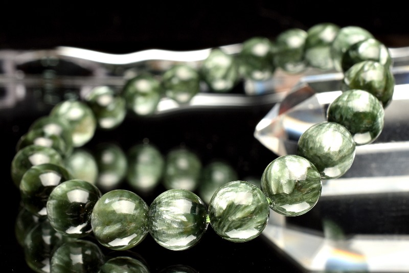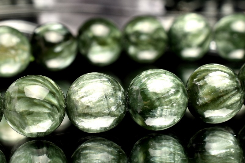 深緑色の地石の中に、白色〜銀色に輝く色彩の模様が「天使の羽」のように見えることがセラフィナイトの特徴です。