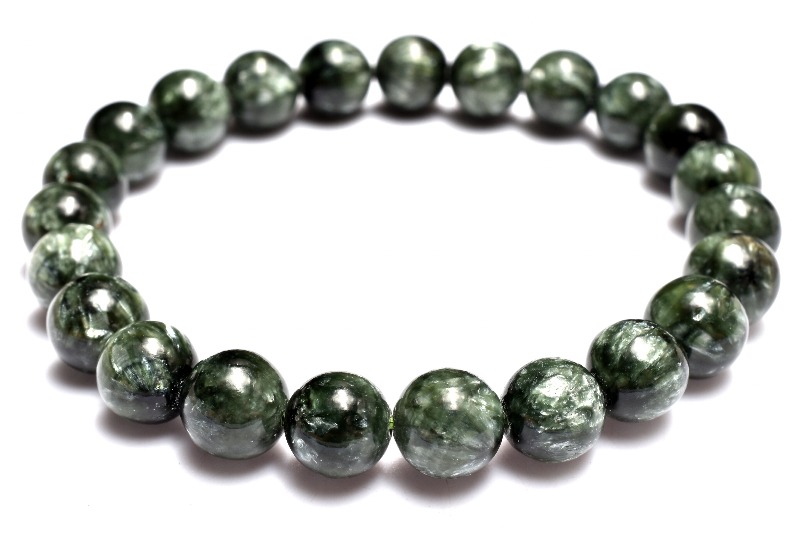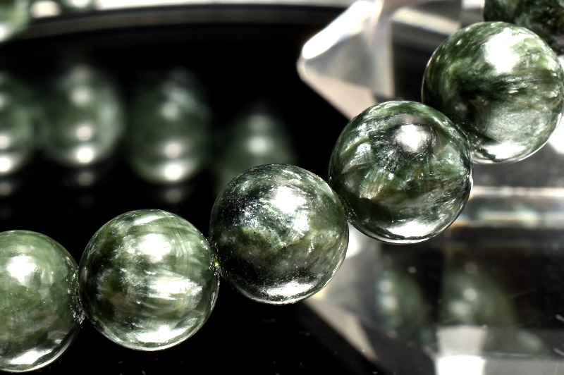 深緑色の地石の中に、白色〜銀色に輝く色彩の模様が「天使の羽」のように見えることがセラフィナイトの特徴です。