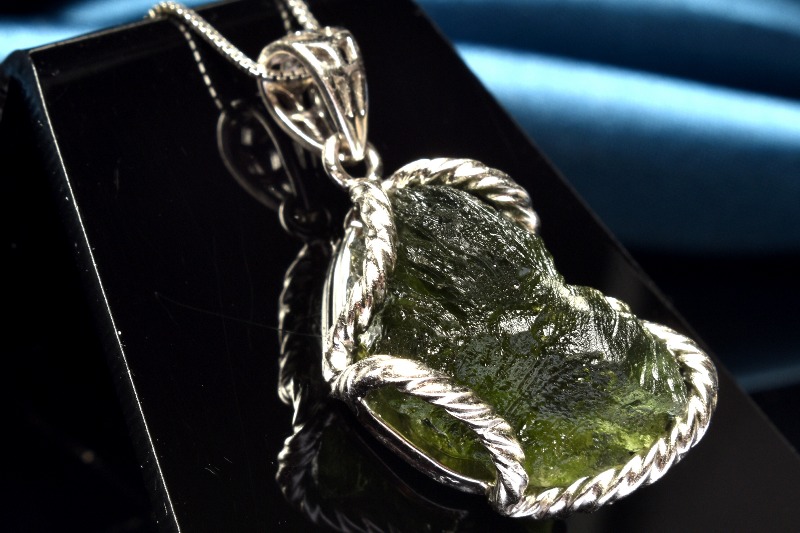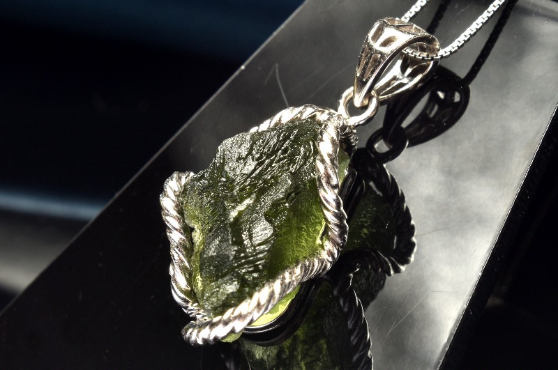 テクタイトは、遥か昔、地球に隕石が衝突した際に、その衝撃で地表の岩石が融解・飛散し、それらが冷やされてガラス質状に固まったものであるとされています。テクタイトは黒色ですが、モルダバイトは緑色、または褐色がかった透明で、ガラス光沢を放っています。