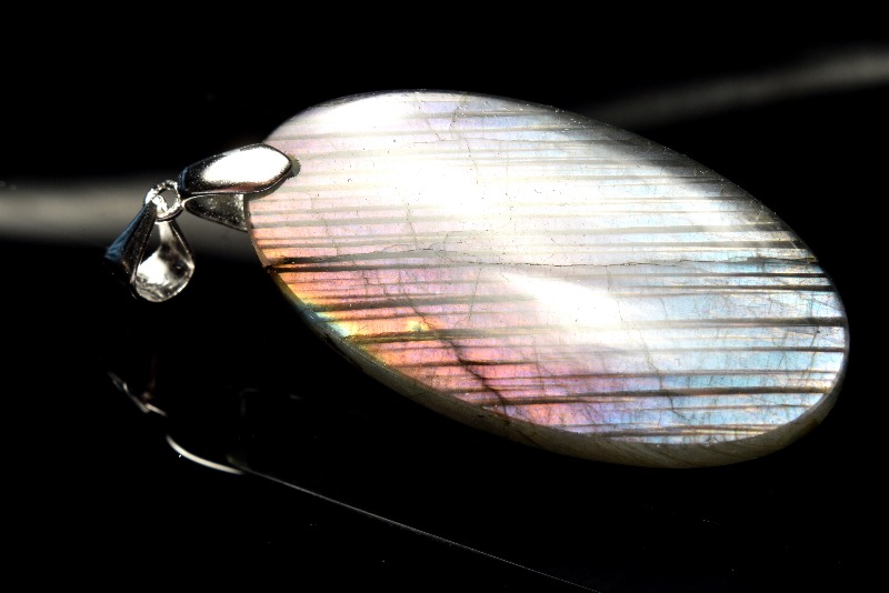 発色の秘密は、この石の成分にあります。曹長石と灰長石が規則正しく縞模様を成すように混ざっているのですが、わずかに屈折率の違う部分がいくつも積み重なると、光の干渉現象が生じ、さまざまな遊色効果(シラー効果)となって現れるのです。