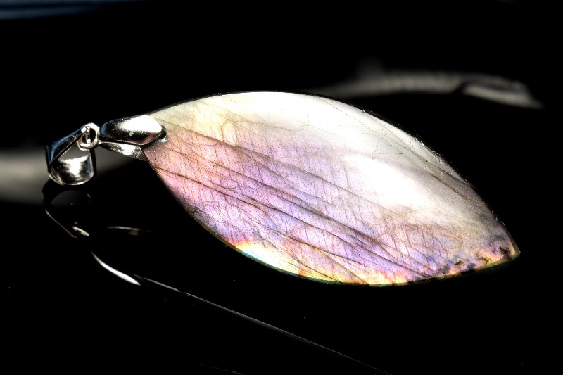 発色の秘密は、この石の成分にあります。曹長石と灰長石が規則正しく縞模様を成すように混ざっているのですが、わずかに屈折率の違う部分がいくつも積み重なると、光の干渉現象が生じ、さまざまな遊色効果(シラー効果)となって現れるのです。