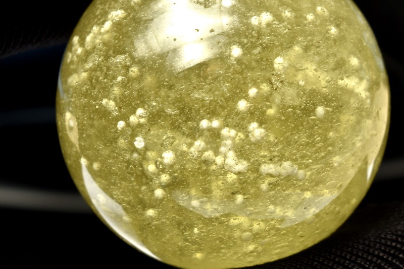 内部に鉄やニッケル等の隕石成分が混ざって発見されることもあるそうです。丸い気泡がバラバラに混在している中、溶融時に流れた模様が穏やかであることから、瞬時にしてガラス化したことがわかります。