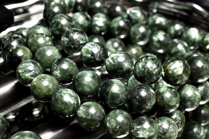 深緑色の地石の中に、白色〜銀色に輝く色彩の模様が「天使の羽」のように見えることがセラフィナイトの特徴です。