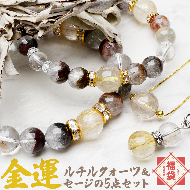 【2026年 招福 金運 財運 5点セット】 ゴールドルチルクォーツ ガーデンクォーツ シルバールチルクォーツ ブレスレット ストラップ ネックレス お守り 福袋 パワーストーン 天然石 _FK4